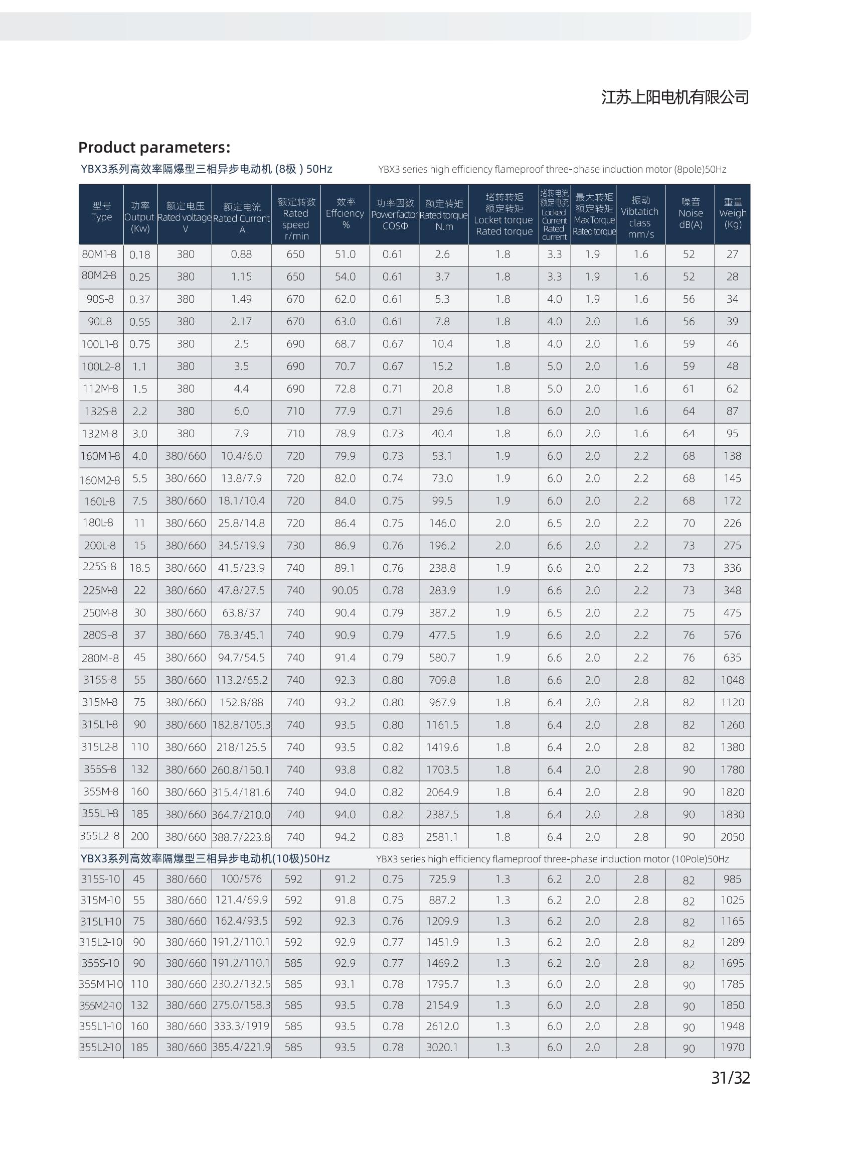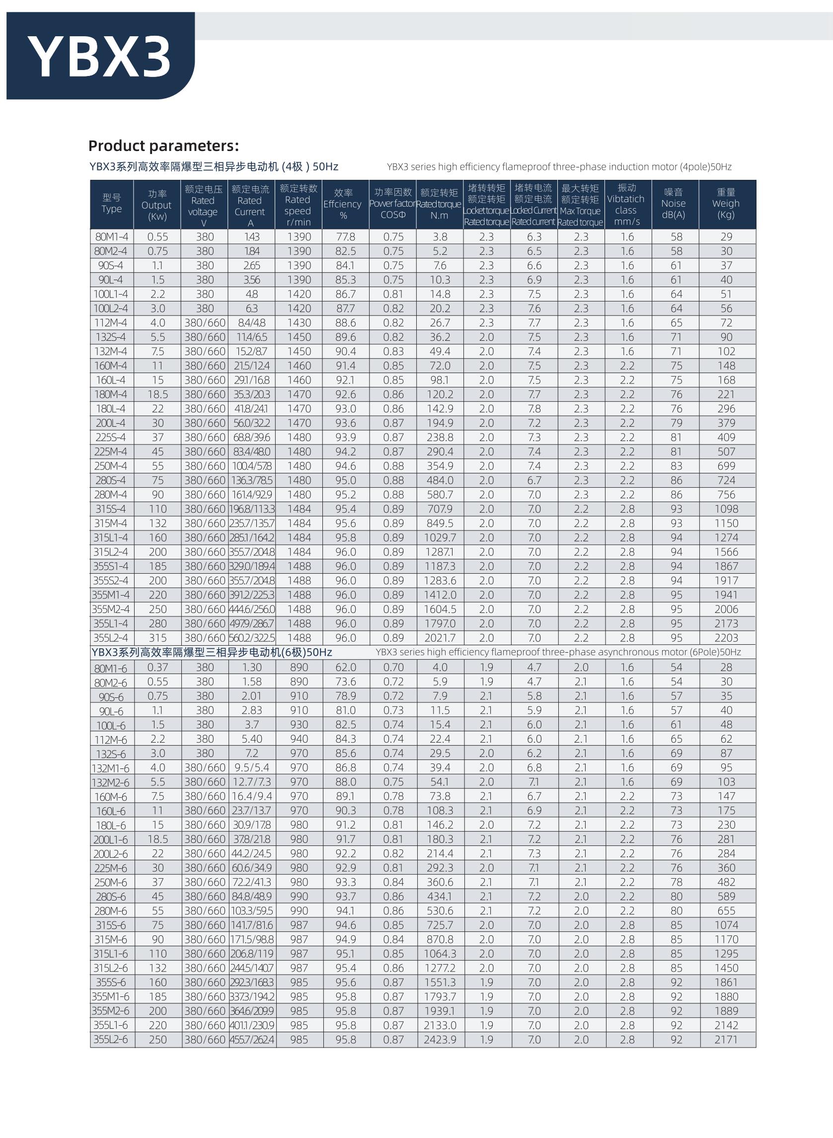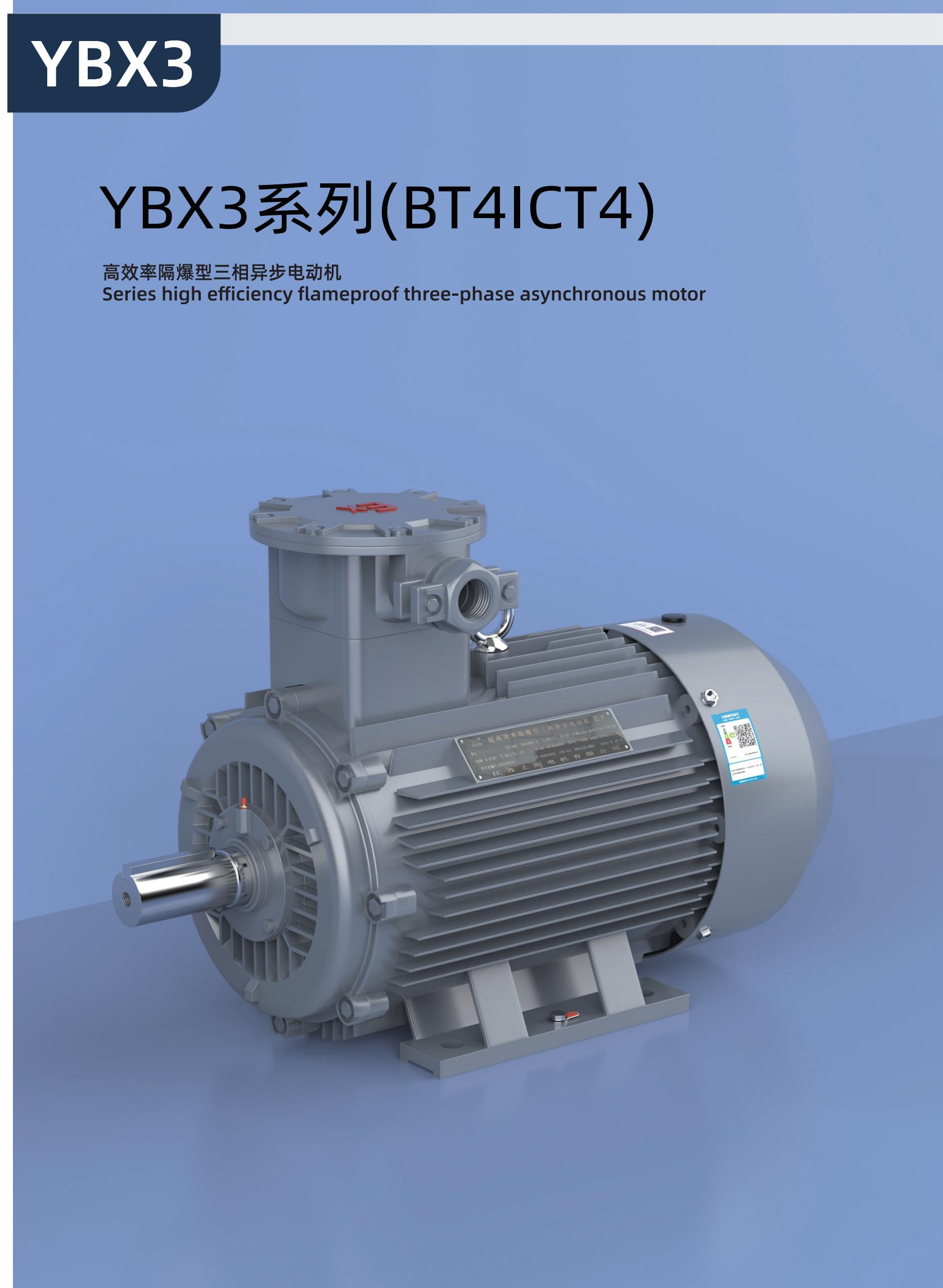 YBX3系列高效率隔爆型三相異步電動機是YB3系列的更新換代產品。本系列電動機具有高效節(jié)能、溫升裕度大、體積小、重量輕、外形美觀、運行可靠、性能好、噪聲低、振動小、使用維護方便的優(yōu)點。本系列電動機的效率指標符合GB18613-2012《中小型三相異步電動機能效限定值及能效等級》電動機能效2級,其功率等級、安裝尺寸符合IEC的標準并與YB3系列電機相同。 本系列電動機的防爆性能符合GB3836.1-2010《爆炸性環(huán)境 第1部分:通用要求》和 GB3836.2-2010《爆炸性環(huán)境 第2部分:由隔爆外殼“d”保護的設備 》標準的規(guī)定,分別制成隔爆型Exd I Mb、ExdⅡBT4 Gb、ExdⅡBT4 Gb、ExdICT4 Gb,適用于煤礦井下(非采掘工作面)及工廠ⅡA、ⅡB、ⅡC級,溫度組分別為T1~T4的爆炸性氣體環(huán)境的危險場所。 在YB3電動機的基礎上,也可以制成YB3-W戶外型、YB3-TH戶內濕熱型、YB3-WTH戶外濕熱型、YB3-WT戶外熱帶型及YB3-WF1戶外中等防腐蝕氣候環(huán)境。
