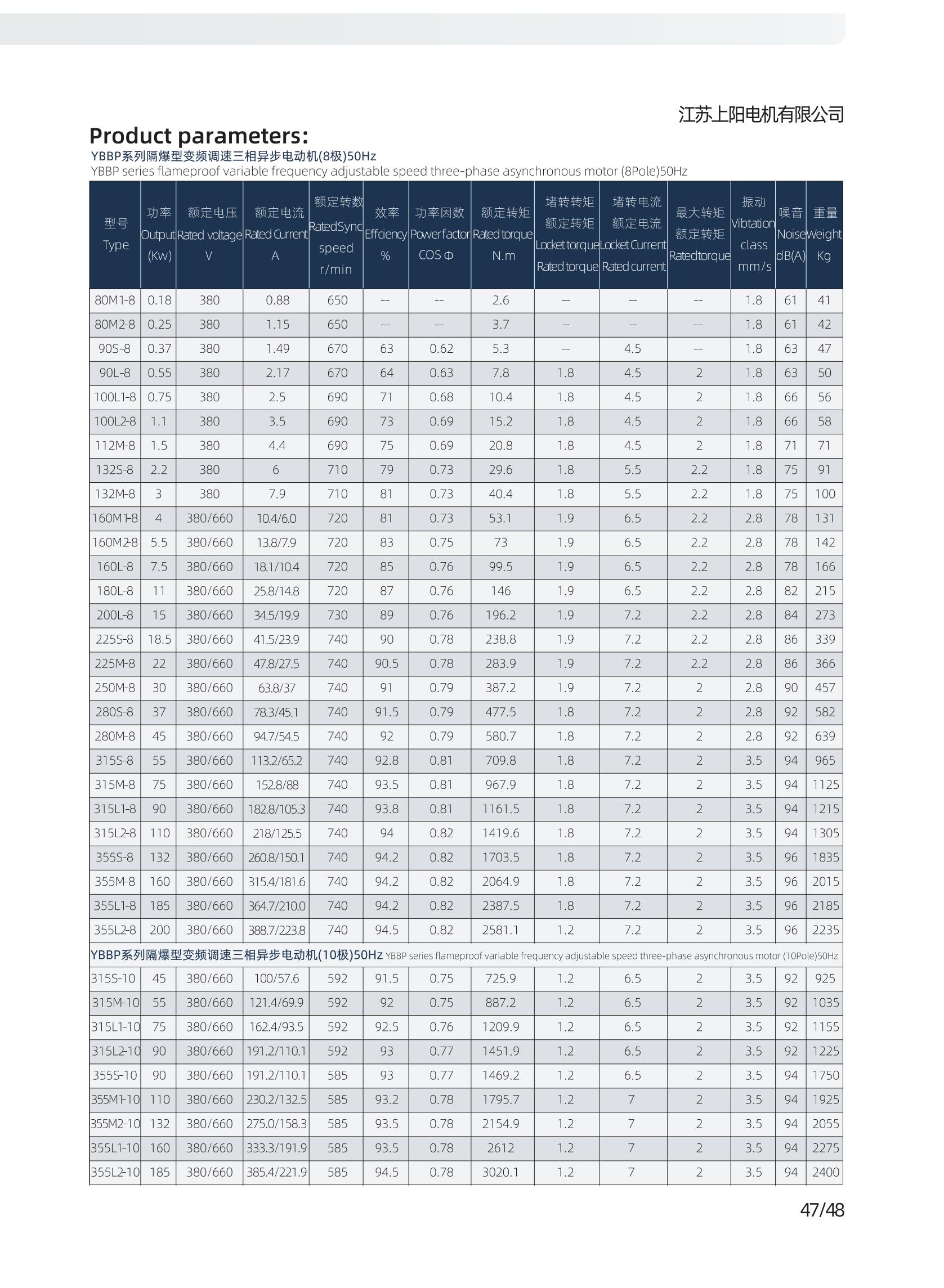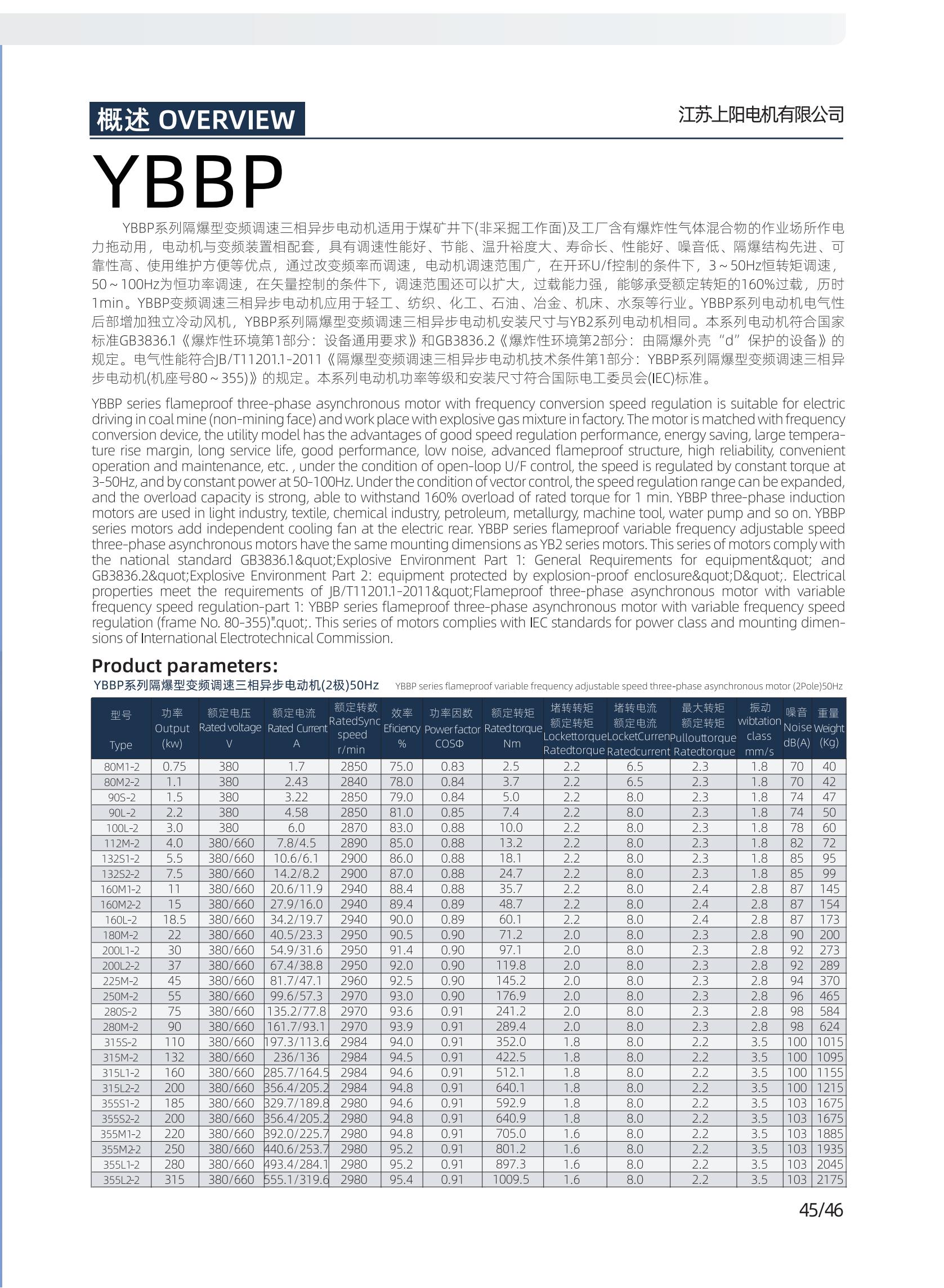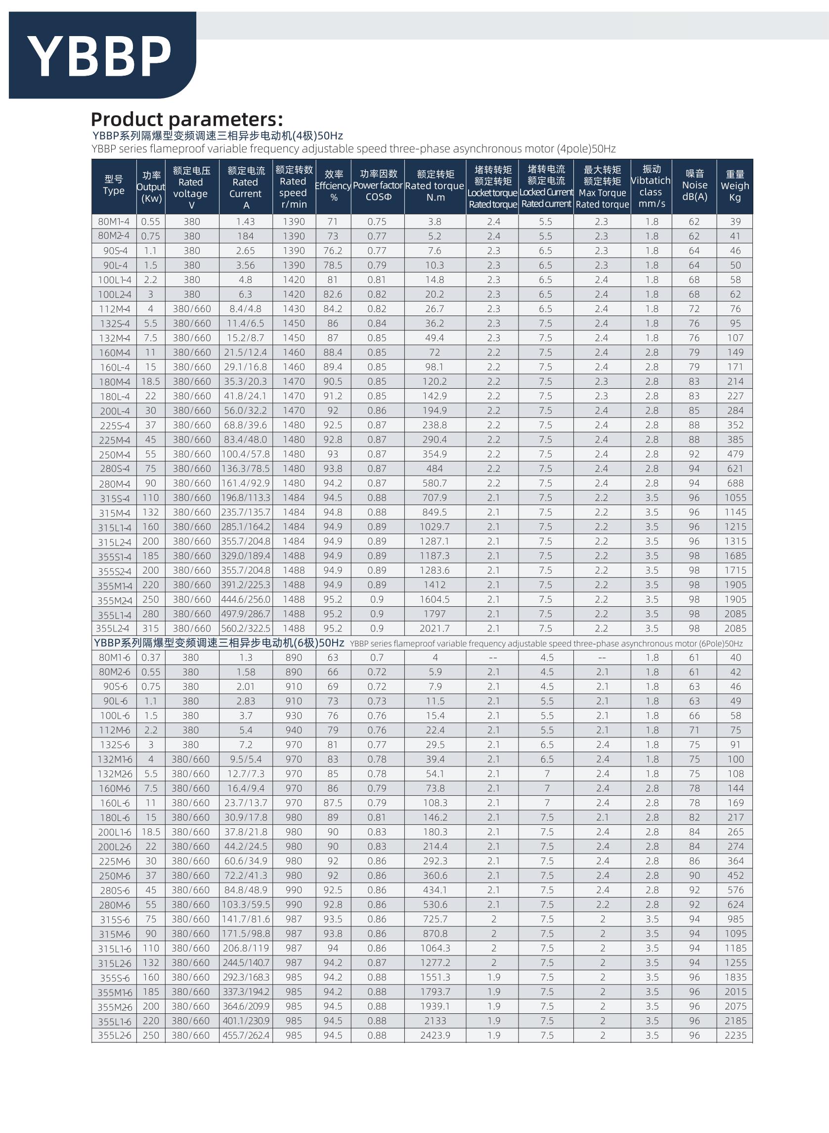 系列隔爆型變頻調(diào)速三相異步電動(dòng)機(jī)適用于煤礦井下(非采掘工作面)及工廠(chǎng)含有爆炸性氣體混合物的作業(yè)場(chǎng)所作電力拖動(dòng)用,電動(dòng)機(jī)與變頻裝置相配套,具有調(diào)速性能好、節(jié)能、溫升裕度大、壽命長(zhǎng)、性能好、噪音低、隔爆結(jié)構(gòu)先進(jìn)、可靠性高、使用維護(hù)方便等優(yōu)點(diǎn),通過(guò)改變頻率而調(diào)速,電動(dòng)機(jī)調(diào)速范圍廣,在開(kāi)環(huán)U/f控制的條件下,3~50Hz恒轉(zhuǎn)矩調(diào)速,50~100Hz為恒功率調(diào)速,在矢量控制的條件下,調(diào)速范圍還可以擴(kuò)大,過(guò)載能力強(qiáng),能夠承受額定轉(zhuǎn)矩的160%過(guò)載,歷時(shí)1min。 YBBP 變頻調(diào)速三相異步電動(dòng)機(jī)應(yīng)用于輕工、紡織、化工、石油、冶金、機(jī)床、水泵等行業(yè)。YBBP系列電動(dòng)機(jī)電氣性后部增加獨(dú)立冷動(dòng)風(fēng)機(jī),YBBP系列隔爆型變頻調(diào)速三相異步電動(dòng)機(jī)安裝尺寸與YB2系列電動(dòng)機(jī)相同。 本系列電動(dòng)機(jī)符合國(guó)家標(biāo)準(zhǔn)GB3836.1《爆炸性環(huán)境 第1部分:設(shè)備 通用要求》和GB3836.2《爆炸性環(huán)境 第2部分:由隔爆外殼“d”保護(hù)的設(shè)備 》的規(guī)定電氣性能符合JB/T 11201.1-2011《隔爆型變頻調(diào)速三相異步電動(dòng)機(jī)技術(shù)條件 第1部分:YBBP系列隔爆型變頻調(diào)速三相異步電動(dòng)機(jī)(機(jī)座號(hào)80~355)》的規(guī)定。本系列電動(dòng)機(jī)功率等級(jí)和安裝尺寸符合國(guó)際電工委員會(huì)(IEC)標(biāo)準(zhǔn)